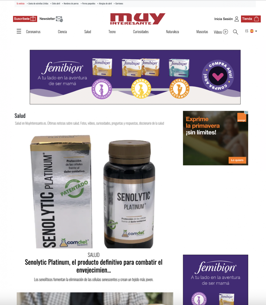 La revista Muy Interesante ha publicado un artículo en el que presenta a Senolytic Platinum como el producto más avanzado para combatir el envejecimiento.